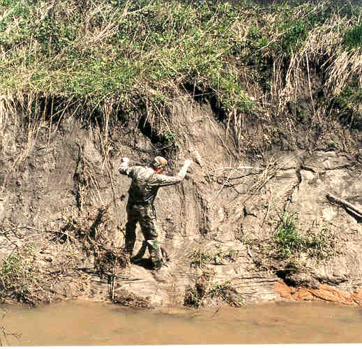 After wading the river, David is stuck in the mud trying to scale the opposite bank.